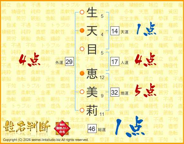 生(5画)天(4画)目(5画) 恵(12画)美(9画)莉(11画)