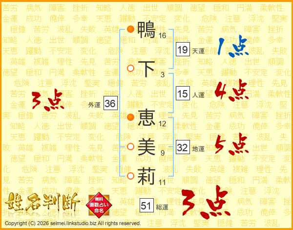 鴨(16画)下(3画) 恵(12画)美(9画)莉(11画)