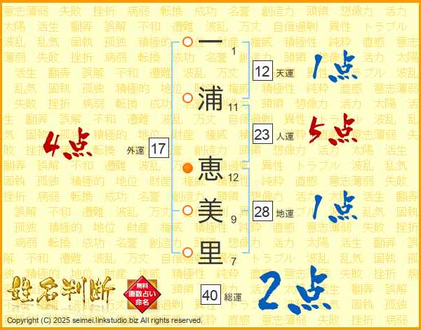 一(1画)浦(11画) 恵(12画)美(9画)里(7画)