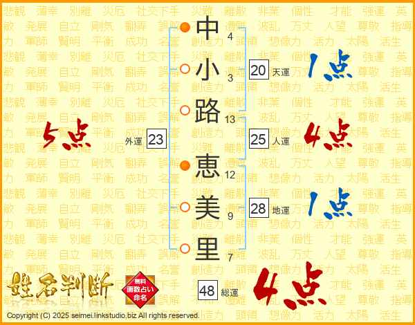 中(4画)小(3画)路(13画) 恵(12画)美(9画)里(7画)