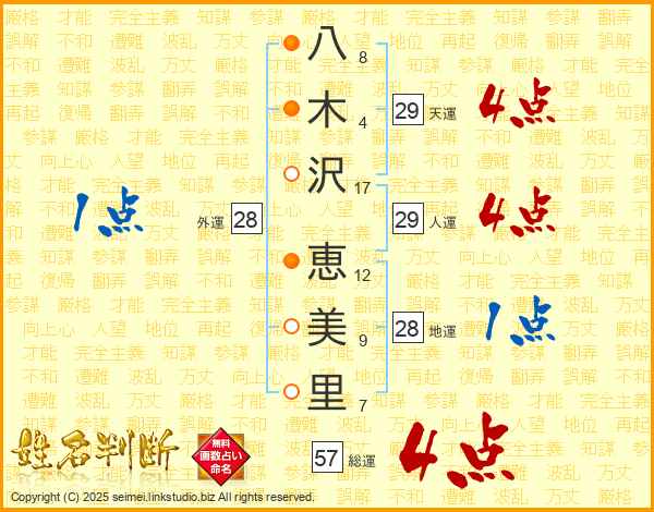 八(8画)木(4画)沢(17画) 恵(12画)美(9画)里(7画)