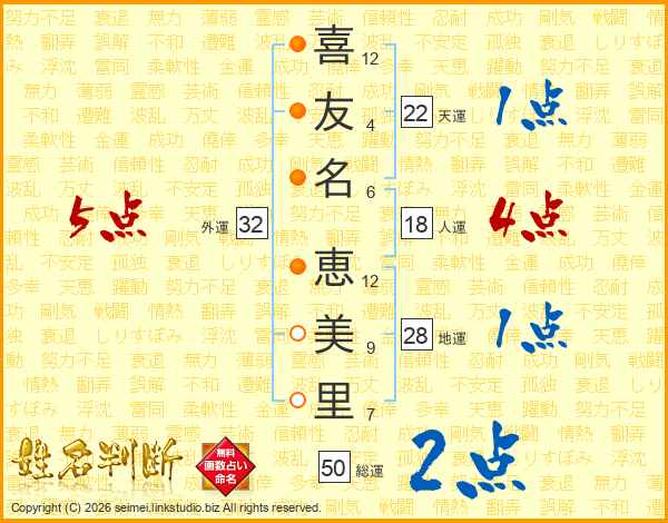 喜(12画)友(4画)名(6画) 恵(12画)美(9画)里(7画)