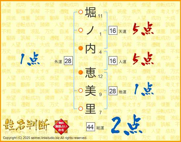 堀(11画)ノ(1画)内(4画) 恵(12画)美(9画)里(7画)