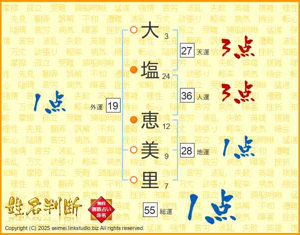 大(3画)塩(24画) 恵(12画)美(9画)里(7画)