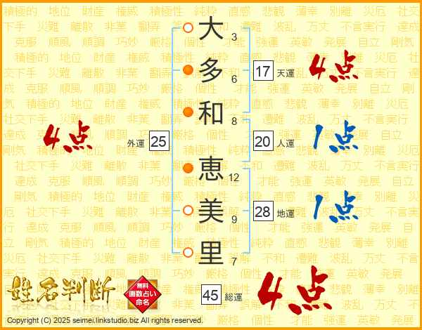 大(3画)多(6画)和(8画) 恵(12画)美(9画)里(7画)