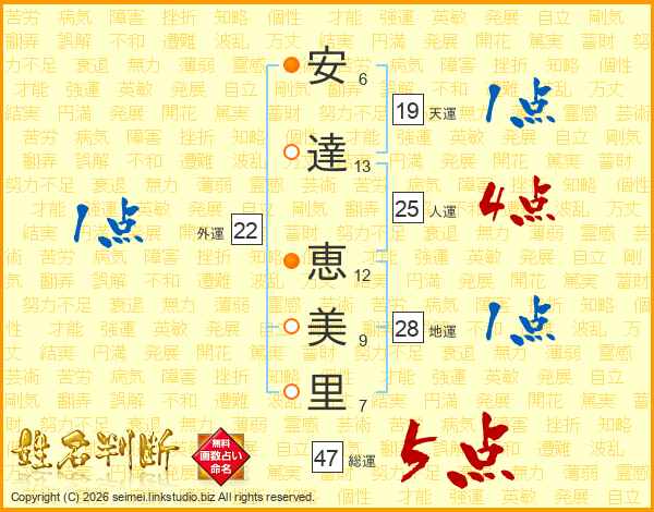 安(6画)達(13画) 恵(12画)美(9画)里(7画)