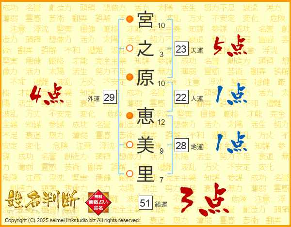 宮(10画)之(3画)原(10画) 恵(12画)美(9画)里(7画)