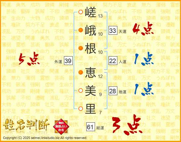 嵯(13画)峨(10画)根(10画) 恵(12画)美(9画)里(7画)