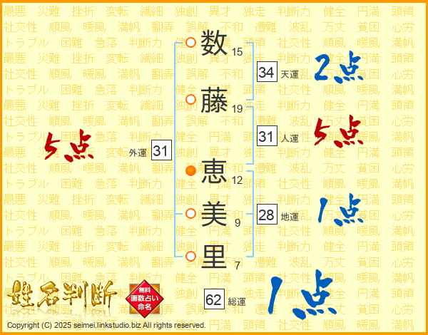 数(15画)藤(19画) 恵(12画)美(9画)里(7画)