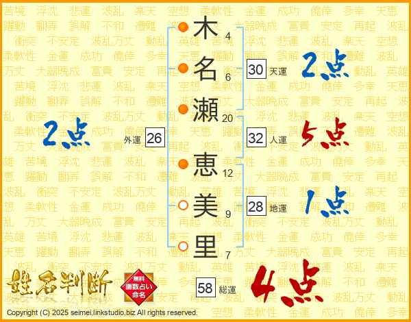 木(4画)名(6画)瀬(20画) 恵(12画)美(9画)里(7画)