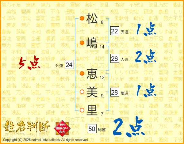 松(8画)嶋(14画) 恵(12画)美(9画)里(7画)