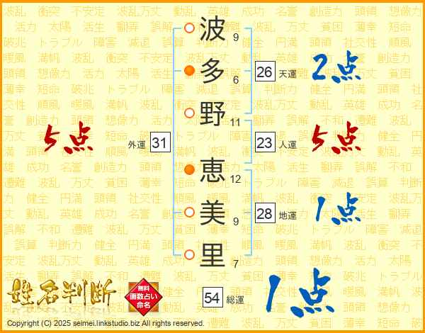 波(9画)多(6画)野(11画) 恵(12画)美(9画)里(7画)