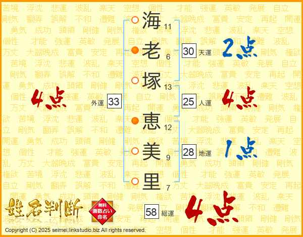 海(11画)老(6画)塚(13画) 恵(12画)美(9画)里(7画)