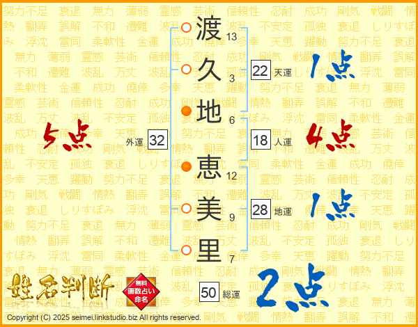 渡(13画)久(3画)地(6画) 恵(12画)美(9画)里(7画)