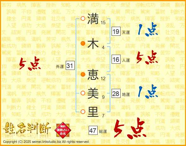 満(15画)木(4画) 恵(12画)美(9画)里(7画)