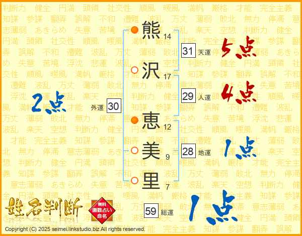 熊(14画)沢(17画) 恵(12画)美(9画)里(7画)