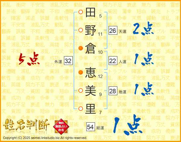 田(5画)野(11画)倉(10画) 恵(12画)美(9画)里(7画)