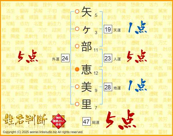矢(5画)ヶ(3画)部(11画) 恵(12画)美(9画)里(7画)