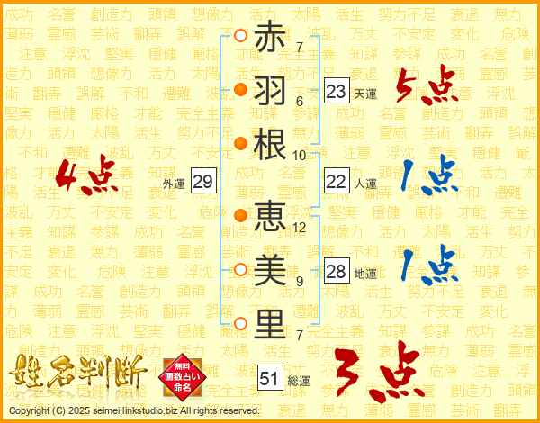 赤羽根恵美里さんの総運は51画の3点!