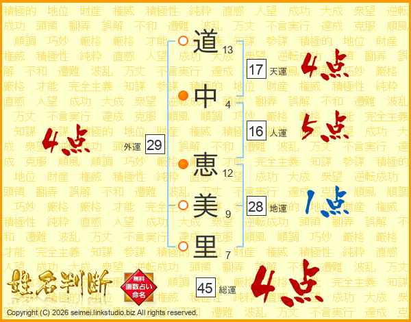 道(13画)中(4画) 恵(12画)美(9画)里(7画)