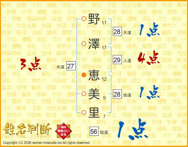 野(11画)澤(17画) 恵(12画)美(9画)里(7画)