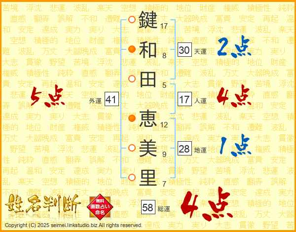 鍵(17画)和(8画)田(5画) 恵(12画)美(9画)里(7画)
