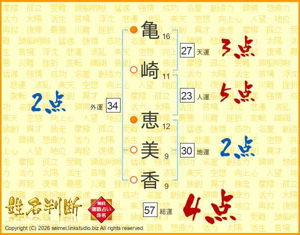 亀(16画)崎(11画) 恵(12画)美(9画)香(9画)