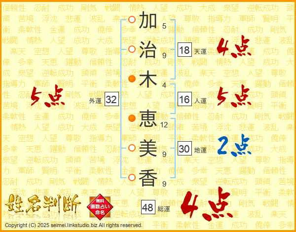 加(5画)治(9画)木(4画) 恵(12画)美(9画)香(9画)