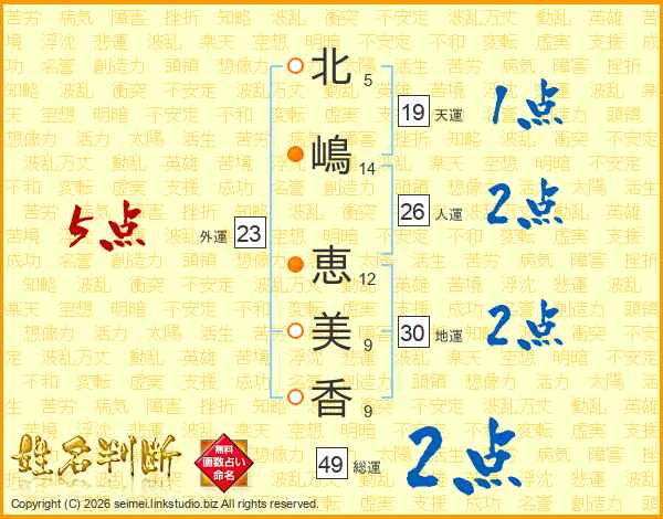 北(5画)嶋(14画) 恵(12画)美(9画)香(9画)