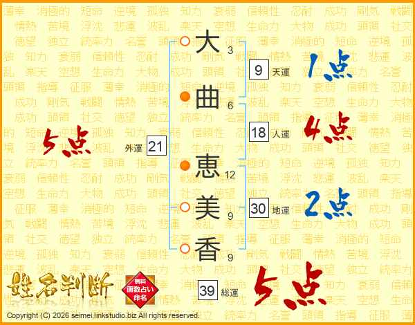 大(3画)曲(6画) 恵(12画)美(9画)香(9画)