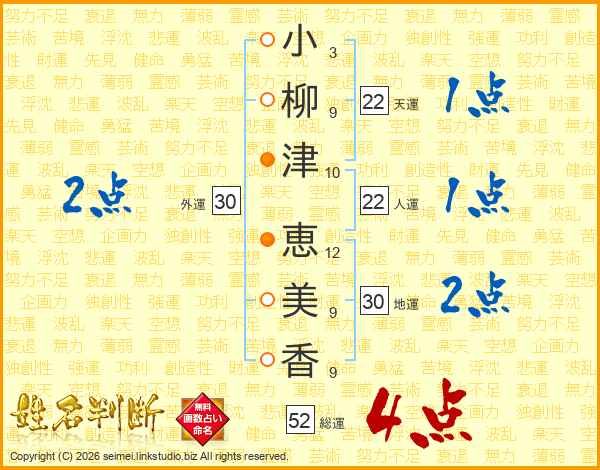 小(3画)柳(9画)津(10画) 恵(12画)美(9画)香(9画)