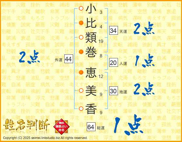 小(3画)比(4画)類(19画)巻(8画) 恵(12画)美(9画)香(9画)