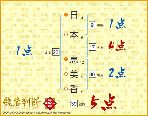 日(4画)本(5画) 恵(12画)美(9画)香(9画)