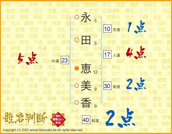 永(5画)田(5画) 恵(12画)美(9画)香(9画)