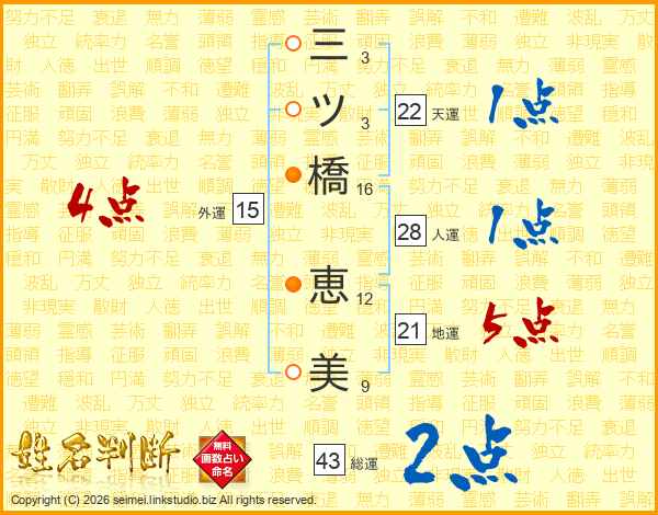 三ツ橋恵美さんの外運は15画の4点!