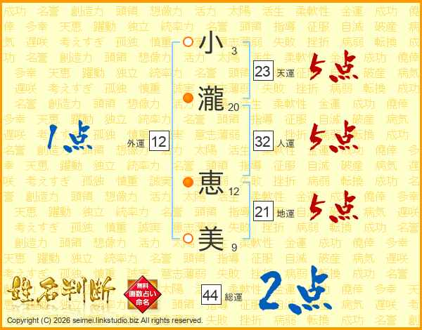 小(3画)瀧(20画) 恵(12画)美(9画)