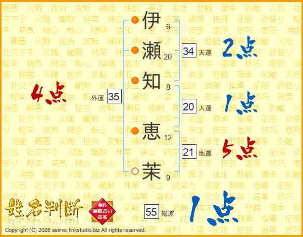 伊(6画)瀬(20画)知(8画) 恵(12画)茉(9画)