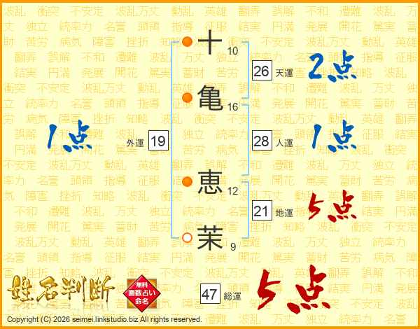十(10画)亀(16画) 恵(12画)茉(9画)