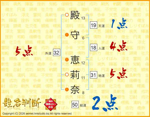 殿(13画)守(6画) 恵(12画)莉(11画)奈(8画)