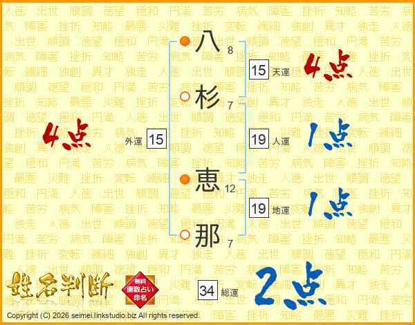 あなたの人生を表す1番重要な運勢です。生涯を通じて影響する総合運となり、主に50歳以降の晩年期に影響を及ぼします。苗字と名前の合計画数。