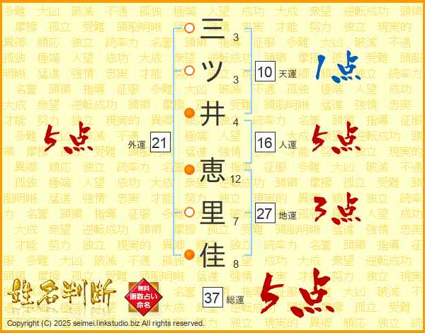 三(3画)ツ(3画)井(4画) 恵(12画)里(7画)佳(8画)
