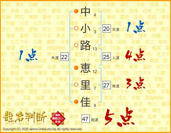 中(4画)小(3画)路(13画) 恵(12画)里(7画)佳(8画)