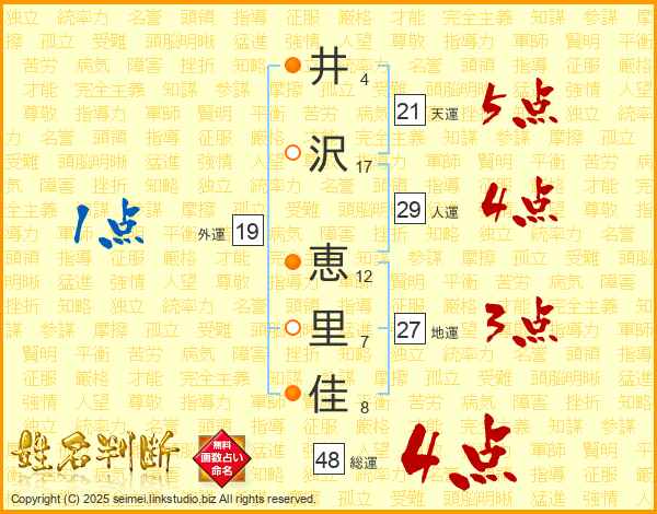 井(4画)沢(17画) 恵(12画)里(7画)佳(8画)