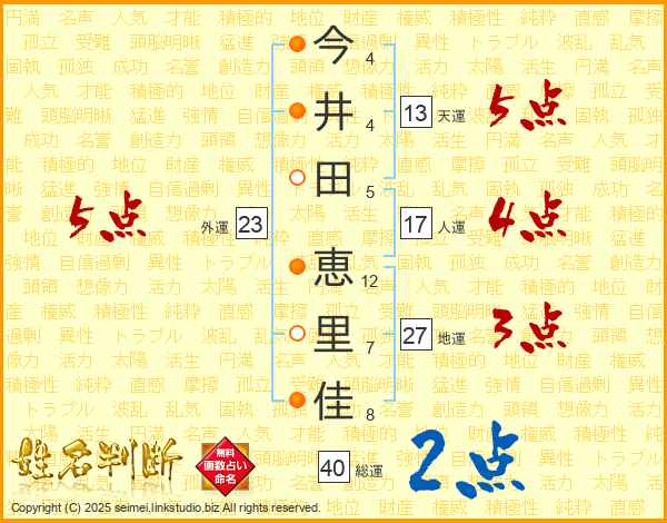 今(4画)井(4画)田(5画) 恵(12画)里(7画)佳(8画)