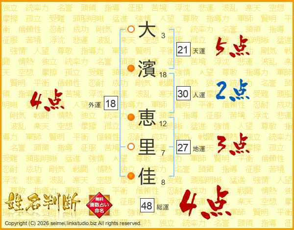 大(3画)濱(18画) 恵(12画)里(7画)佳(8画)