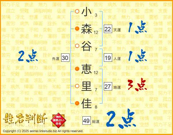 小(3画)森(12画)谷(7画)  恵(12画)里(7画)佳(8画)