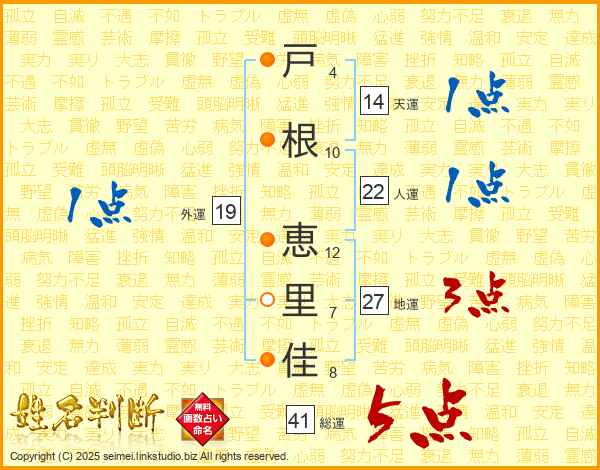戸(4画)根(10画) 恵(12画)里(7画)佳(8画)