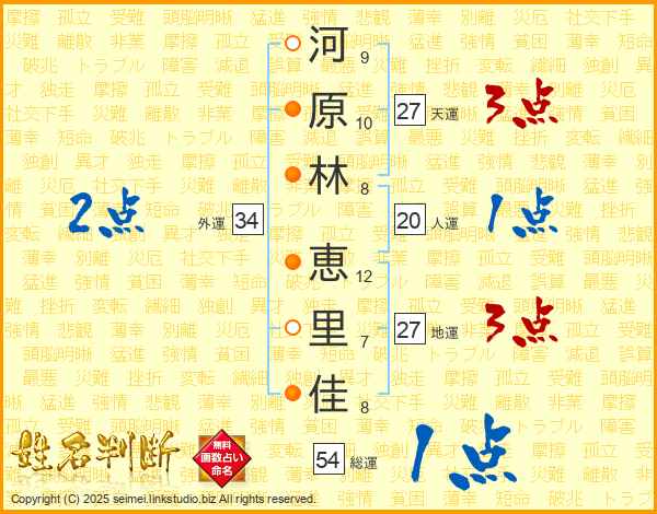 河(9画)原(10画)林(8画) 恵(12画)里(7画)佳(8画)