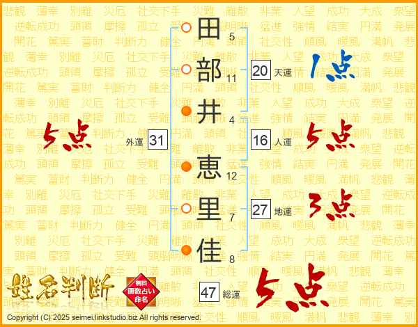 田(5画)部(11画)井(4画) 恵(12画)里(7画)佳(8画)