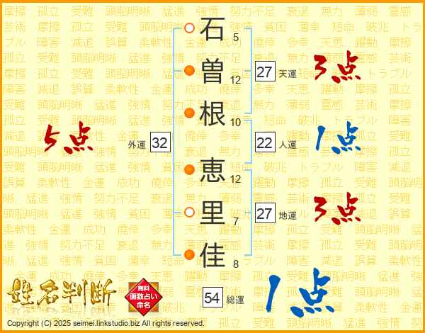 石(5画)曽(12画)根(10画) 恵(12画)里(7画)佳(8画)